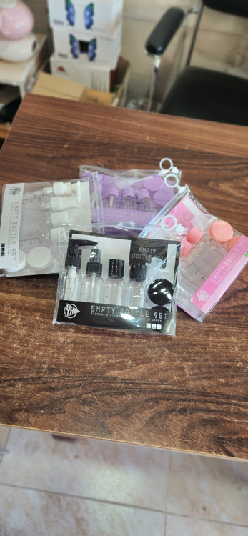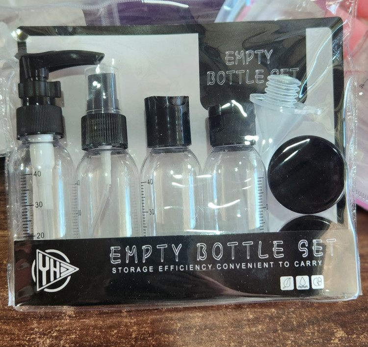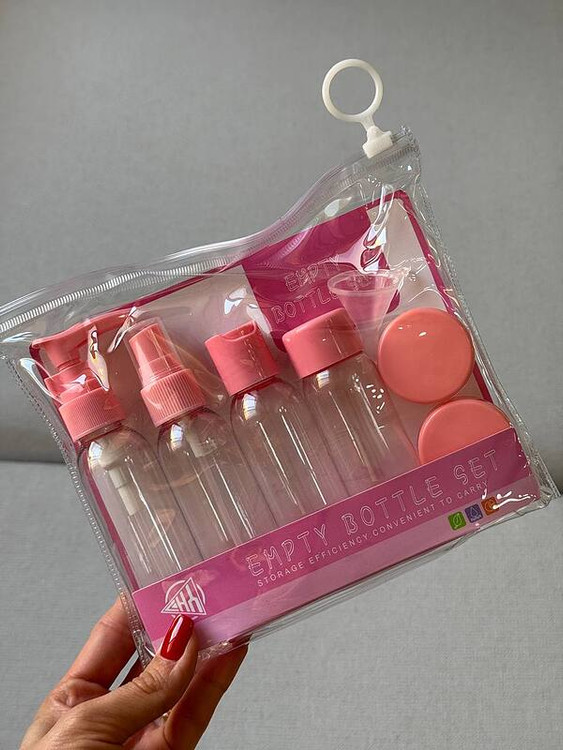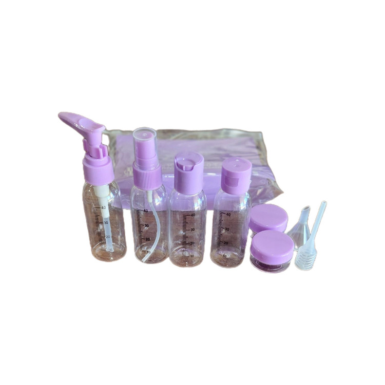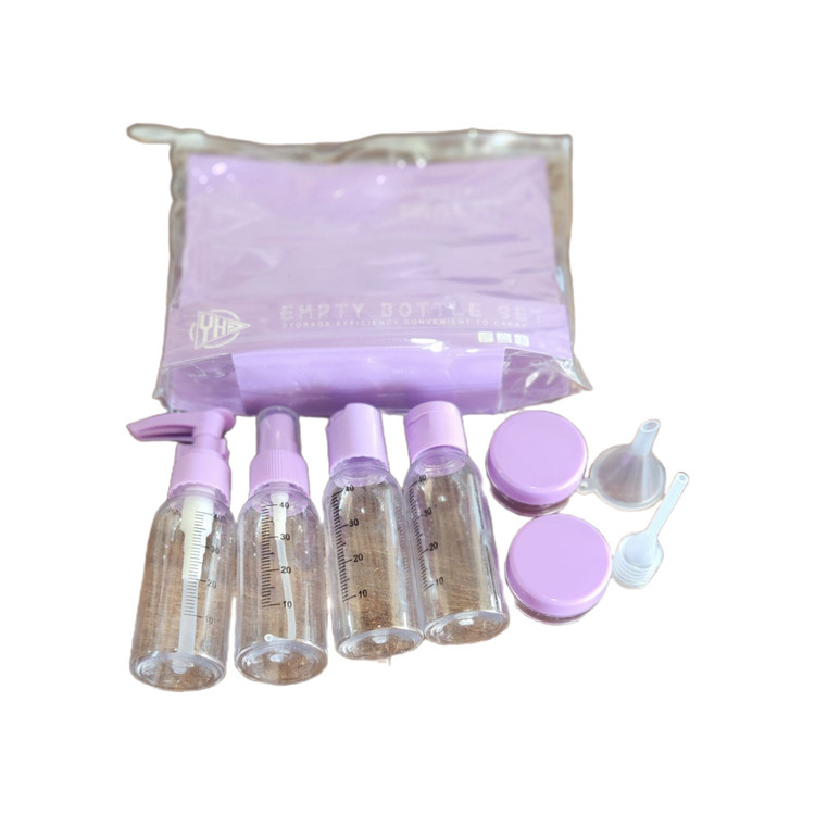 ست مسافرتی ارایشی و بهداشتی که شامل 1عدد بطری پمپی 1عدد بطری اسپری 2عدد بطری فشاری و 2عدد ظرف کاسه ای و یک عدد قیف و قلم همزن دار