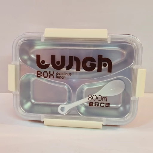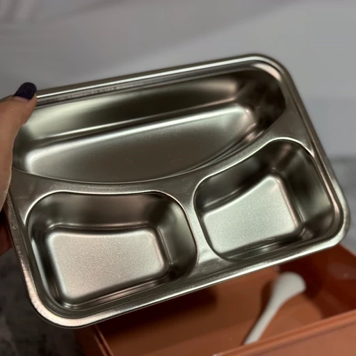 از جنس استیل با روکش پلاستیکی با 3محفظه مجزا و یک قاشق همراه