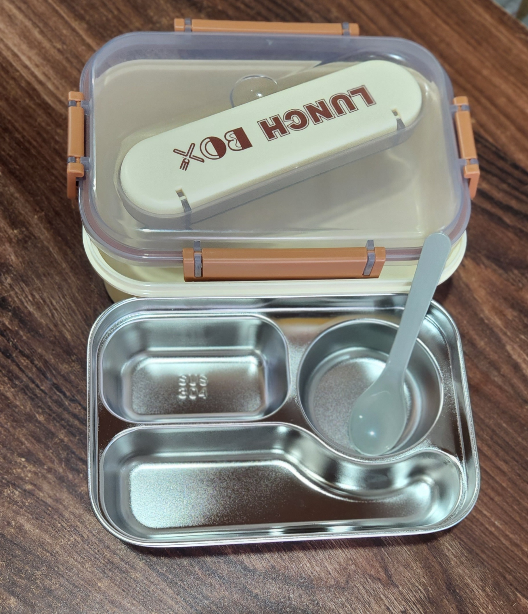 لانچ باکس استیل 3خانه با بدنه پلاستیک و ظرف استیل این ظرف ها انتی باکتریال هستند و از خراب شدن غذا جلوگیری میکند درب واشر دار و کاملا بدون نشتی به همراه قاشق دارای محفظه برای نگهداری قاشق سازگار با محیط زیست
