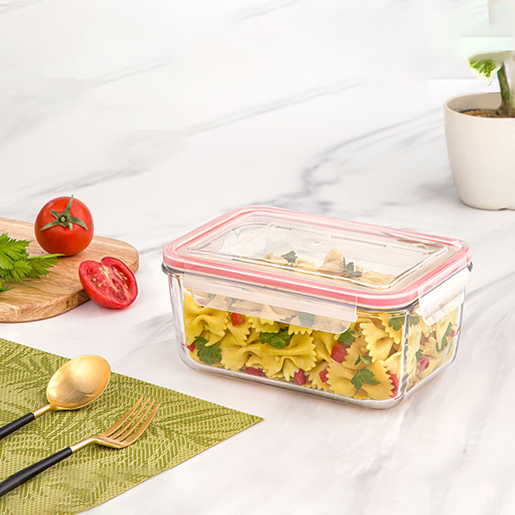 ظرف شیشه ای مستطیل دربدار لیمون جنس بدنه محصول شیشه ای و جنس درب ان پلاستیکی است
